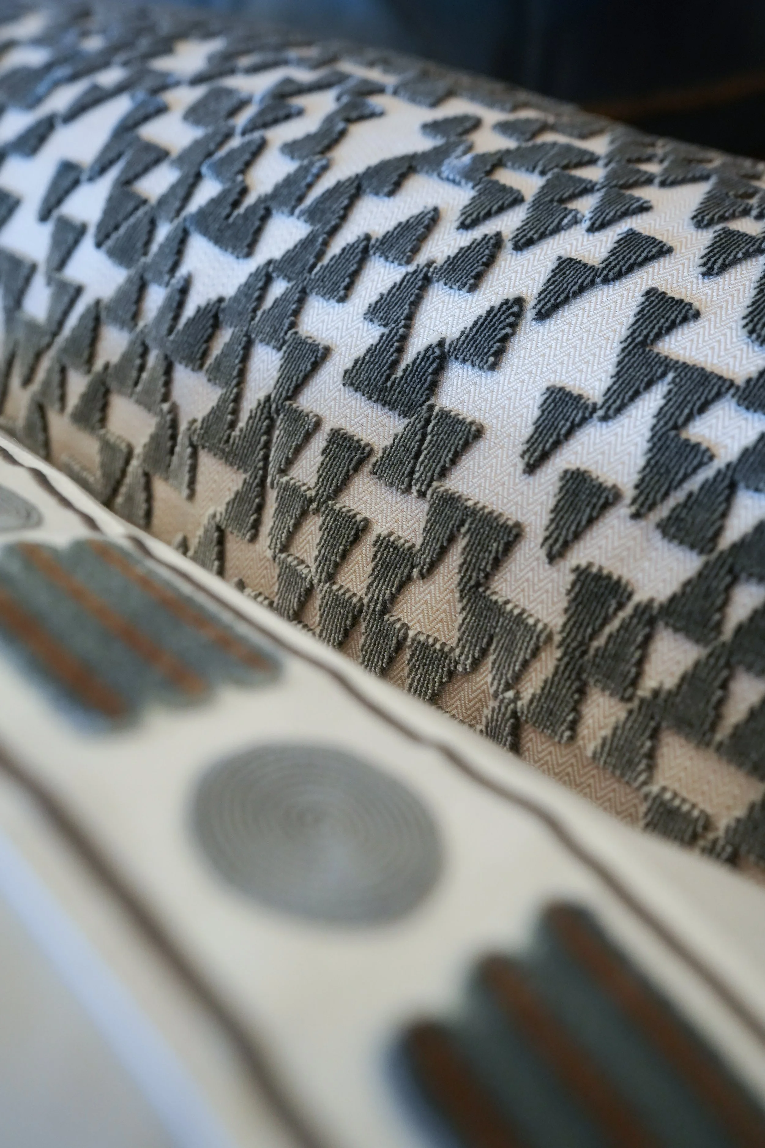 3 The Aft Deck Sofas. White powder coated metal framing. Value engineering the existing legs to fit onto new design. New upholstered cushions and pillows.